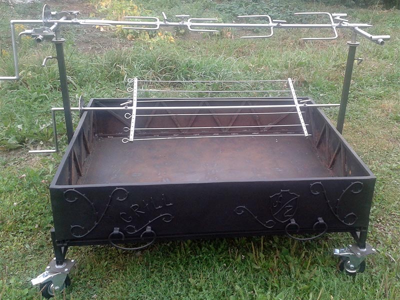 Мангал сделан из термостойкого металла толщиной 2.5 мм, длина 1м 30см, ширина 1м., рёбра жёсткости на днище, а также - по периметру, покрашен термостойкой краской. Мангал мобилен (термостойкие итальянские колёса с поворотным механизмом и тормозом и регулировкой высоты). Есть элементы ковки, ручки, авторский герб (можно личный). Штатив и опоры мангала разборные.